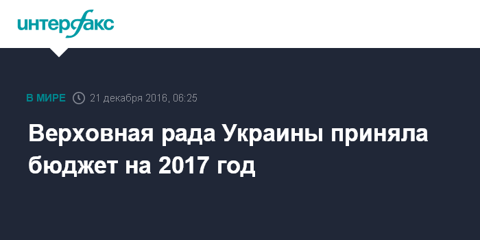 Москва. 21 декабря. INTERFAX.RU - Депутаты Верховной рады Украины приняли государственный бюджет 2017 года, сообщает в среду УНИАН. Закон был принят 274 голосами при необходимых 226.