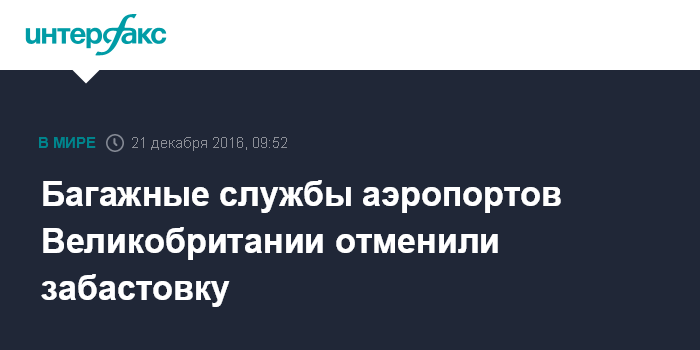 Москва. 21 декабря. INTERFAX.RU - Сотрудники 18 аэропортов Великобритании, входящие в профсоюз Unite, отказались от двухдневной забастовки, которую они планировали провести перед Рождеством, пишет Birmingham Mail.
