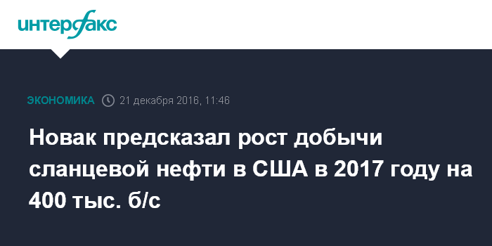 Москва. 21 декабря. INTERFAX.RU - Рост добычи сланцевой нефти в США в 2017 году может составить 300-400 тысяч баррелей в сутки, считает министр энергетики РФ Александр Новак.