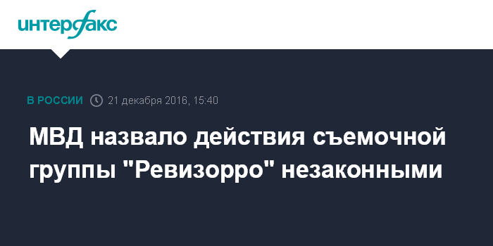 Москва. 21 декабря. INTERFAX.RU - МВД России дало юридические разъяснения по поводу неправомерности действий съемочной группы телепередачи "Ревизорро" и предупредило журналистов об ответственности за злоупотребление свободой средств массовой информации.