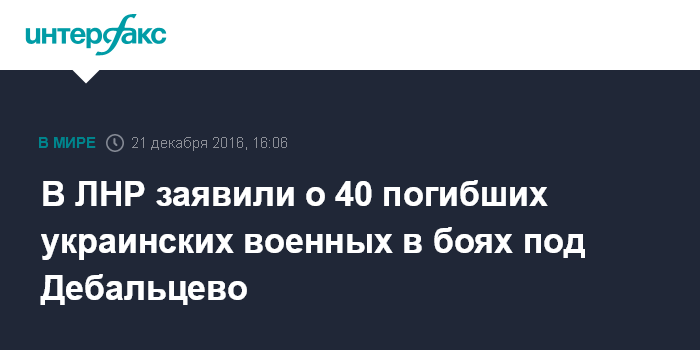 Москва. 21 декабря. INTERFAX.RU - Украинские военные в ходе боестолкновений на Дебальцевском направлении потеряли 40 бойцов убитыми и более 50 ранеными, сообщил в среду представитель Народной милиции самопровозглашенной Луганской народной республики Андрей Марочко.
