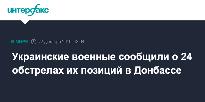Москва. 22 декабря. INTERFAX.RU - За прошедшие сутки в зоне боевых действий в Донбассе позиции украинских военных обстреливались 24 раза, сообщает в четверг пресс-служба штаба силовой операции.