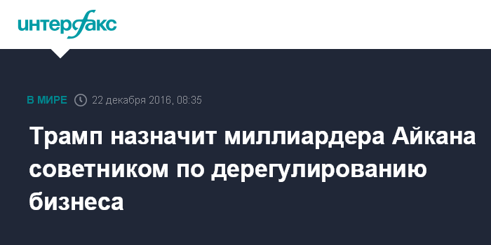 Трамп обещает провести тотальную ревизию норм регулирования бизнеса, чтобы обеспечить создание в США новых рабочих мест. Айкан сказал The Wall Street Journal, что избранный президент хотел бы освободить бизнес от страха перед "разрушительными" и "абсурдными правилами регулирования, установленными бюрократами".