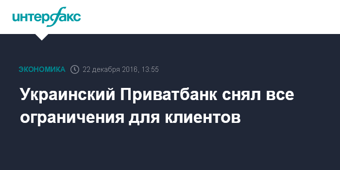 Москва. 22 декабря. INTERFAX.RU - Национализированный Приватбанк снял ограничения для клиентов и предоставил доступ ко всем услугам, выполнявшимся ранее до введения в банк временной администрации, сообщил глава правления банка Александр Шлапак.