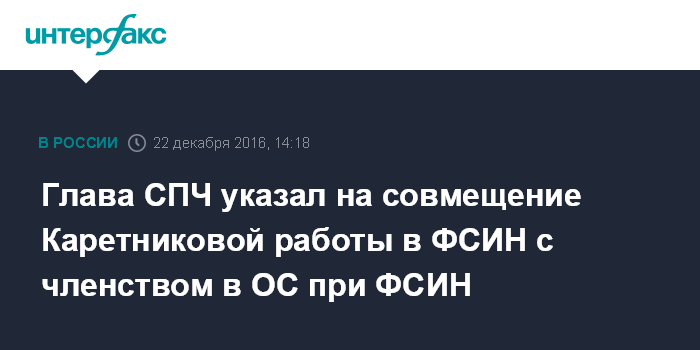 Москва. 22 декабря. INTERFAX.RU - Глава Совета по правам человека при президенте РФ Михаил Федотов просит Федеральную службу исполнения наказаний проверить, как правозащитница Анна Каретникова может совмещать работу в ФСИН и членство в общественном совете при службе.