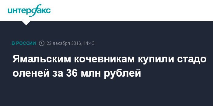 Москва. 22 декабря. INTERFAX.RU - Семьи кочевников Ямальского района ЯНАО, лишившиеся своих оленей в результате летней вспышки сибирской язвы, получили всю необходимую помощь, в том числе новых животных, сообщает пресс-служба губернатора.