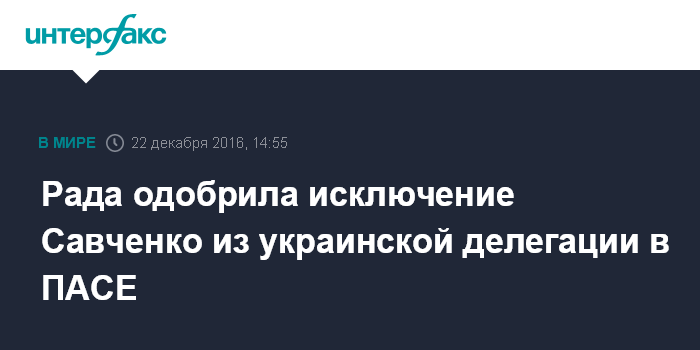 Москва. 22 декабря. INTERFAX.RU - Верховная рада поддержала постановление об исключении народного депутата Надежды Савченко из состава делегации украинского парламента в Парламентской ассамблее Совета Европы (ПАСЕ)
