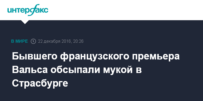 Москва. 22 декабря. INTERFAX.RU - Муку из пакета высыпал прохожий в лицо французскому экс-премьеру Манюэлю Вальсу, сообщает французская газета Le Figaro.