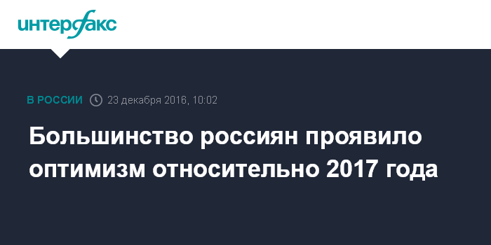 Москва. 23 декабря. INTERFAX.RU - Более половины россиян (53%) надеются, что новый год будет для них лучше, чем уходящий 2016 год, пессимистично настроены лишь 4% респондентов, сообщили "Интерфаксу" в "Левада-Центре".