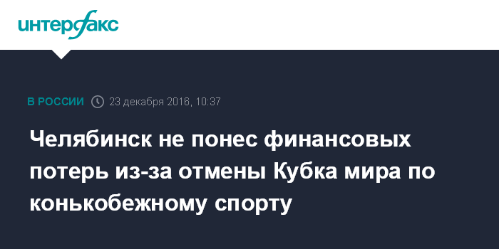Москва. 23 декабря. INTERFAX.RU - Челябинская область, которая начала подготовку к проведению финала Кубка мира по конькобежному спорту, не понесла крупных финансовых потерь из-за решения Международного союза конькобежцев (ISU) об его отмене.