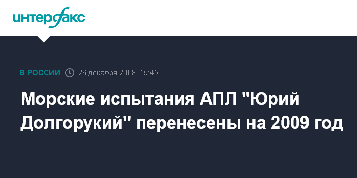 Москва. 26 декабря. INTERFAX.RU - Выход атомного подводного ракетоносца "Юрий Долгорукий", строящегося на ОАО "ПО "Севмашпредприятие", в акваторию Белого моря перенесен на 2009 год.