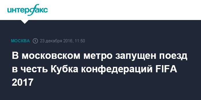 Москва. 23 декабря. INTERFAX.RU - Церемония запуска тематического поезда Московского метрополитена, посвященного Кубку конфедераций FIFA 2017, прошла в пятницу. Кубок конфедераций пройдет в России с 17 июня по 2 июля.