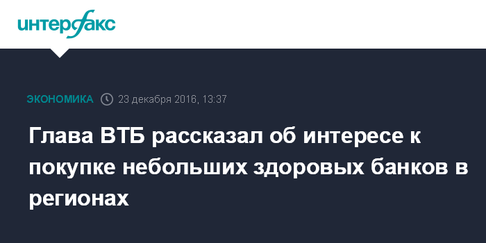Вместе с тем, группа ВТБ рассматривает вариант покупки небольших здоровых региональных банков. Глава ВТБ допустил, что приобретение может состояться до завершения процесса присоединения ВТБ 24 к банку ВТБ, намеченного на начало 2018 года.