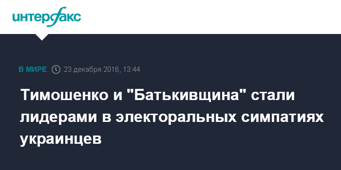 Москва. 23 декабря. INTERFAX.RU - За лидера партии "Батькивщина" Юлию Тимошенко на выборах президента Украины готовы проголосовать 17,7% украинцев, за действующего главу государства Петра Порошенко - 13,5%, а замыкает тройку лидеров сопредседатель парламентской фракции "Оппозиционный блок" Юрий Бойко с 10,4%, свидетельствуют результаты опроса социологической группы "Рейтинг".