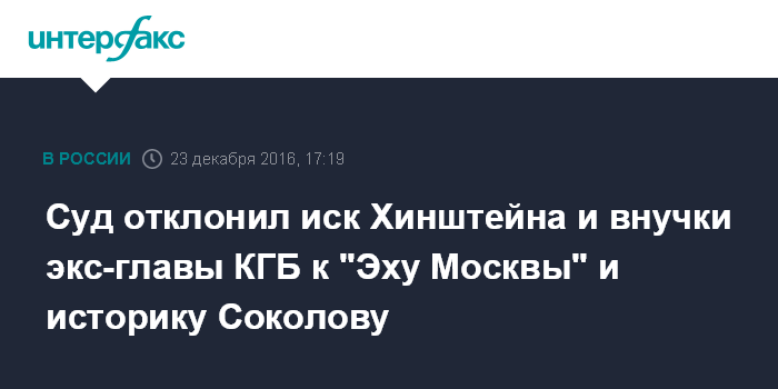 Москва. 23 декабря. INTERFAX.RU - Пресненский суд Москвы отказал в удовлетворении иска внучки первого руководителя КГБ Ивана Серова Веры и депутата шестого созыва Госдумы Александра Хинштейна на 3,5 млн рублей к радиостанции "Эхо Москвы" и историку Борису Соколову, передал корреспондент "Интерфакса".