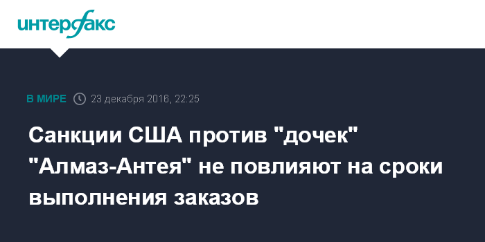 Москва. 23 декабря. INTERFAX.RU - Введение Соединенными Штатами санкций в отношении ряда организаций, входящих в концерн "Алмаз-Антей", не окажут никакого негативного эффекта на ход и сроки реализации заказов, имеющихся в его портфеле, заявил в пятницу замглавы МИД РФ Сергей Рябков.