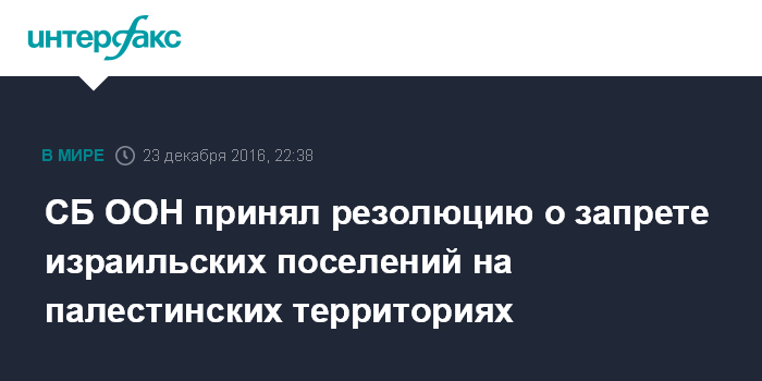 Москва. 23 декабря. INTERFAX.RU - СБ ООН в пятницу большинством голосов одобрил проект резолюции с требованием к Израилю остановить поселенческую деятельность на оккупированных палестинских территориях.