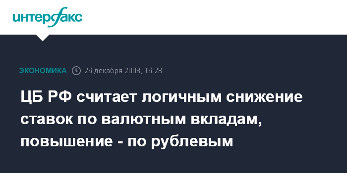 Москва. 26 декабря. INTERFAX.RU - ЦБ РФ считает логичным снижение ставок по валютным вкладам и повышение по рублевым.