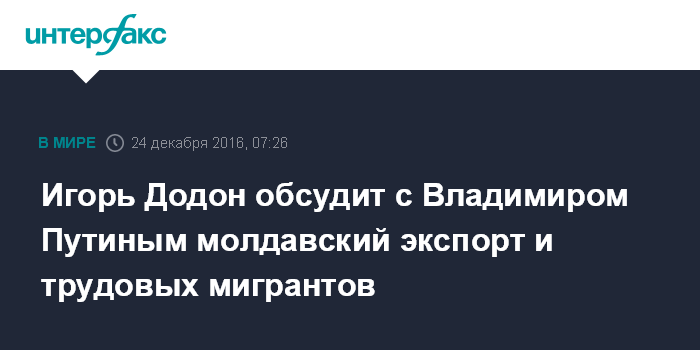 По его словам, в ходе переговоров в Москве он намерен "обсудить два ключевых вопроса: возврат молдавской продукции на российский рынок, а также проблему молдавских трудовых мигрантов в России".