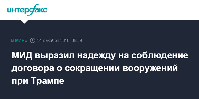 Москва. 24 декабря. INTERFAX.RU - Замглавы МИД России Сергей Рябков выразил надежду на то, что и при новой администрации президента США Дональда Трампа российско-американский договор о сокращении стратегических наступательных вооружений от 2010 года будет успешно выполняться.