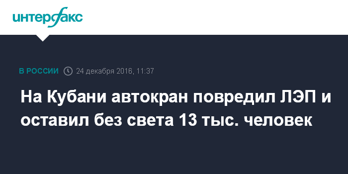 На Кубани автокран повредил ЛЭП и оставил без света 13 тыс. человек