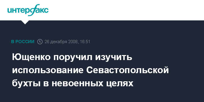 Москва. 26 декабря. INTERFAX.RU - Президент Украины Виктор Ющенко создал рабочую группу, которой предложил подготовить предложения по использованию после 2017 г. инфраструктуры Севастопольской бухты в невоенных целях, перепрофилированию и модернизации логистической, в том числе портовой, инфраструктуры.