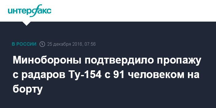 Москва. 25 декабря. INTERFAX.RU - При выполнении планового перелета с аэродрома в г.Адлер в 5.40 (мск), после взлета, пропала отметка с радиолокационных радаров самолета Ту-154. На борту находилось 83 пассажира и восемь членов экипажа, сообщает Департамент информации и массовых коммуникаций Минобороны РФ.