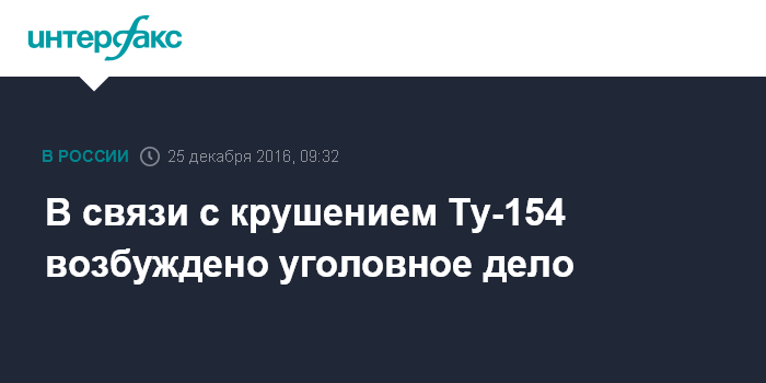 Москва. 25 декабря. INTERFAX.RU - Уголовное дело возбуждено по факту падения ТУ-154 в Черном море, сообщила "Интерфаксу" официальный представитель СКР Светлана Петренко.