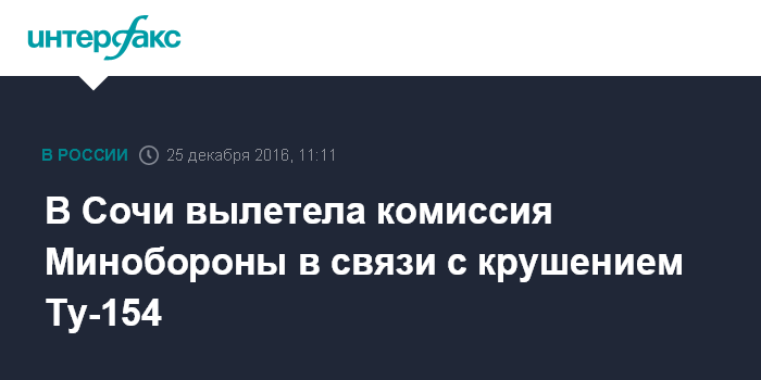Москва. 25 декабря. INTERFAX.RU - Комиссия Минобороны под руководством замминистра обороны генерала армии Павла Попова вылетела на место крушения самолета Ту-154, сообщил официальный представитель оборонного ведомства генерал-майор Игорь Конашенков.