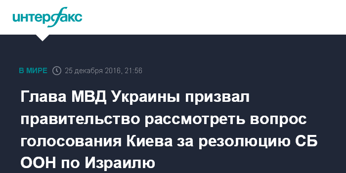 Москва. 25 декабря. INTERFAX.RU - Министр внутренних дел Украины Арсен Аваков считает необходимым рассмотреть вопрос голосования Украины за резолюцию Совета безопасности ООН, которая призвала Израиль прекратить строительство поселений на палестинских территориях, на заседании кабинета министров Украины.