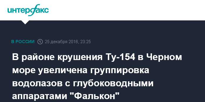Москва. 25 декабря. INTERFAX.RU - МЧС России нарастило группировку водолазов в районе крушения самолёта Ту-154 Минобороны РФ, сообщили в Южном региональном центре МЧС.