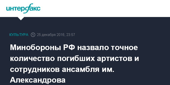Минобороны РФ назвало точное количество погибших артистов и сотрудников ансамбля им. Александрова