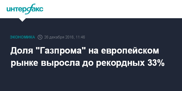 Достижение доли в 31% за 2015 год в "Газпроме" с гордостью называли невиданным историческим результатом. "В настоящее время мы вышли на максимальный исторический уровень доли на европейском рынке газа - это 31%. При этом доля увеличивается, и тому подтверждение - рост объемов поставки нашего российского газа на экспорт в страны Европейского союза", - комментировал результат глава "Газпрома" Алексей Миллер в сентябре этого года.