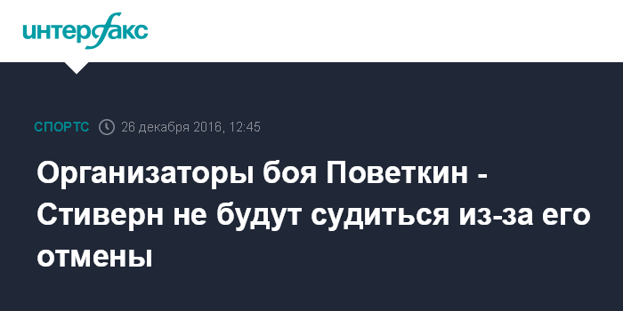 Москва. 26 декабря. INTERFAX.RU - Промоутерская компания RCC Boxing Promotions, которая занималась организацией боя Александра Поветкина в Екатеринбурге, не будет подавать иск из-за отмены боя с Бермейном Стиверном, сообщил исполнительный директор компании Алексей Титов на пресс-конференции в Екатеринбурге в понедельник.