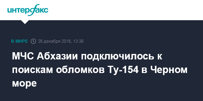 Москва. 26 декабря. INTERFAX.RU - Спасательная бригада МЧС Абхазии принимает участие в поиске обломков самолета Ту-154 и останков тел пассажиров в морской акватории Гагрского района, сообщил руководитель госинспекции маломерных судов МЧС республики Тенгиз Басария.