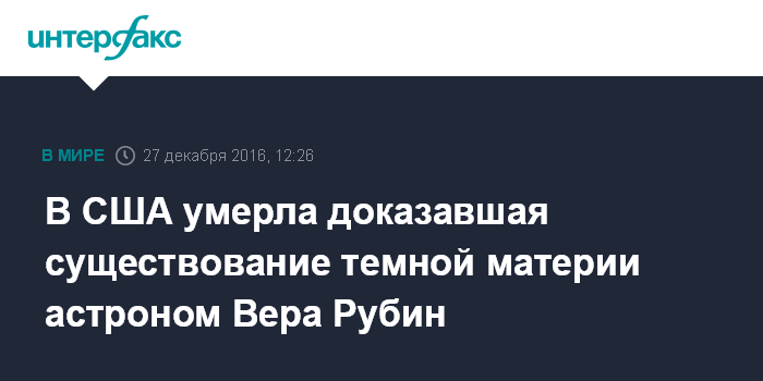 Москва. 27 декабря. INTERFAX.RU - Американский астроном Вера Рубин, чьи исследования помогли доказать существование темной материи, скончалась в воскресенье в возрасте 88 лет, сообщает во вторник американский телеканал Fox News со ссылкой на ее сына. Рубин жила в городе Принстон (штат Нью-Джерси).