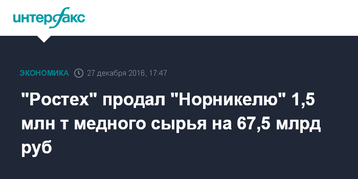 "Ростех" продал "Норникелю" 1,5 млн т медного сырья на 67,5 млрд руб