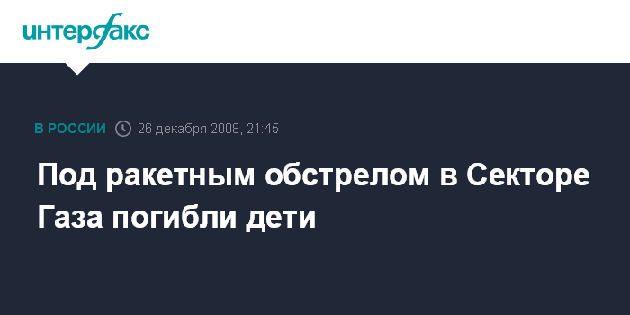 Москва. 26 декабря. INTERFAX.RU - Ракета, запущенная из сектора Газа в сторону Израиля, не долетела до цели и поразила двух палестинских девочек, сообщает в пятницу израильская газета Jerusalem Post. Ракета упала в северной части сектора Газа. Возраст погибших детей - пять и 13 лет, отмечает газета.