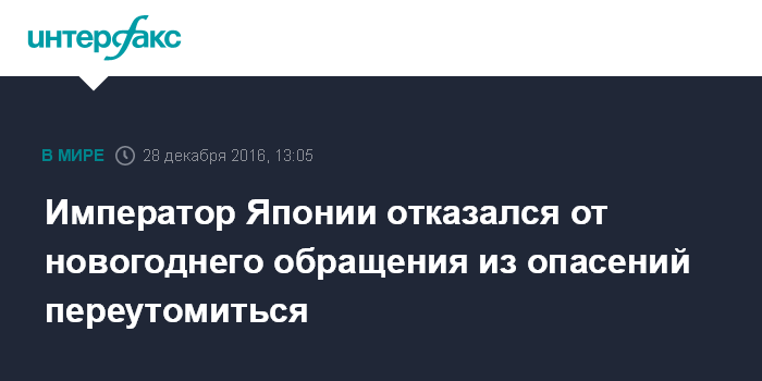 Москва. 28 декабря. INTERFAX.RU - 83-летний император Японии Акихито не будет выступать с традиционным посланием для жителей страны, приуроченным к Новому году, чтобы не переутомиться, сообщает японское издание "Майнити" со ссылкой на управление императорского двора.