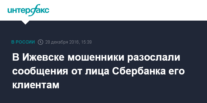 Москва. 28 декабря. INTERFAX.RU - УМВД России по Ижевску в среду предупредило жителей города о новом мошенничестве, которое преступники совершают от имени Сбербанка.
