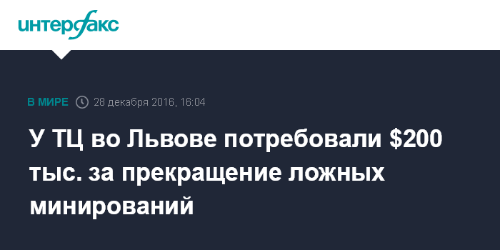 Москва. 28 декабря. INTERFAX.RU - Неизвестный вымогает у львовского торгового центра "Роксолана" 200 биткойнов за прекращение ложных сообщений о минировании здания ТЦ.