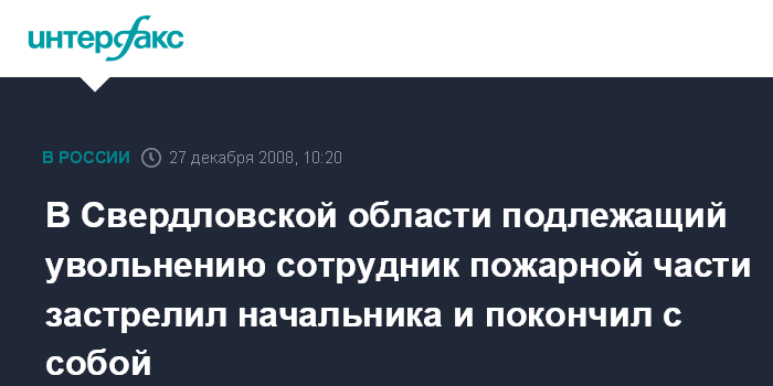 Москва. 27 декабря. INTERFAX.RU - В одной из пожарных частей Свердловской области 44-летний сотрудник расстрелял начальника пожарной части, после чего застрелился сам. Предполагают, что на преступление пожарного толкнуло увольнение.