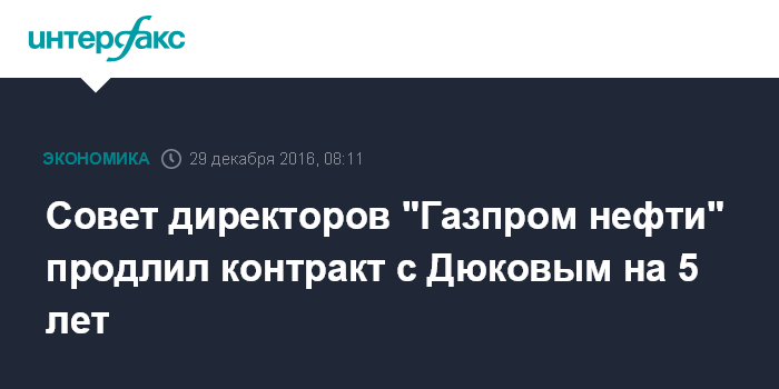 Москва. 29 декабря. INTERFAX.RU - Совет директоров ПАО "Газпром нефть" на заседании в среду продлил контракт с Александром Дюковым на посту генерального директора еще на пять лет (с 31 декабря 2016 года), сообщил эмитент.