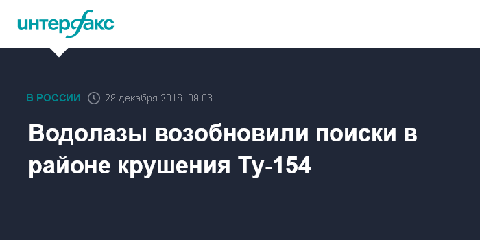 Москва. 29 декабря. INTERFAX.RU - Возобновилась работа водолазов по поиску фрагментов самолета Ту-154, сообщили агентству "Интерфакс" в пресс-службе ЮРПСО МЧС России в четверг.
