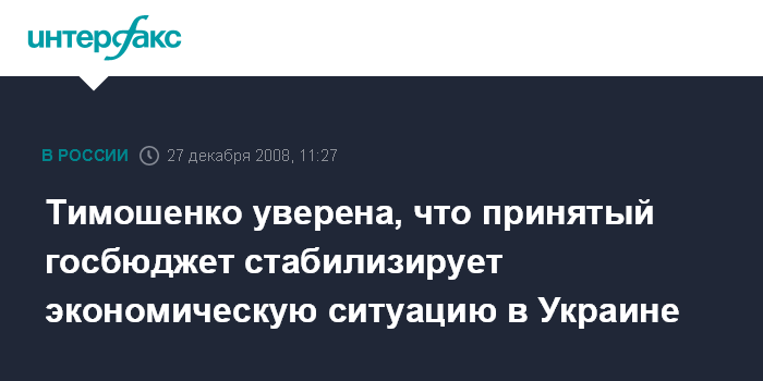 Москва. 27 декабря. INTERFAX.RU - Премьер-министр Украины Юлия Тимошенко убеждена, что принятый в парламенте государственный бюджет на 2009 год позволит стабилизировать экономическую ситуацию в Украине.