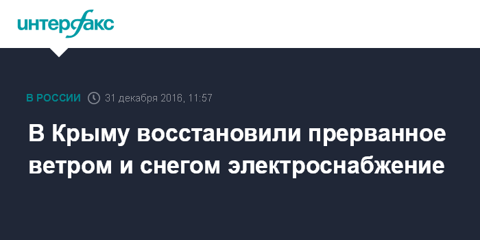 Москва. 31 декабря. INTERFAX.RU - Энергетики восстановили электросети в Крыму после вызванных ветром и снегом аварий, оставивших без электроснабжения почти 28 тысяч человек, сообщила в субботу пресс-служба ГУ МЧС по республике.