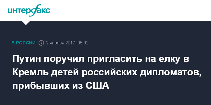 Москва. 2 января. INTERFAX.RU - Президент России Владимир Путин поручил пригласить на кремлевскую новогоднюю елку всех детей сотрудников российских загранучреждений, прибывших из США, сообщили журналистам в Кремле.