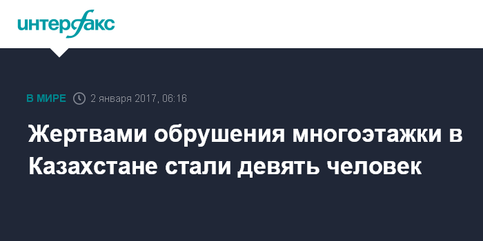 Москва. 2 января. INTERFAX.RU - В поселке Шахан города Шахтинск Карагандинской области Казахстана в ночь на понедельник обрушился многоэтажный дом, погибли девять человек, сообщили агентству "Интерфакс-Казахстан" в оперативном штабе при акимате поселка Шахан.
