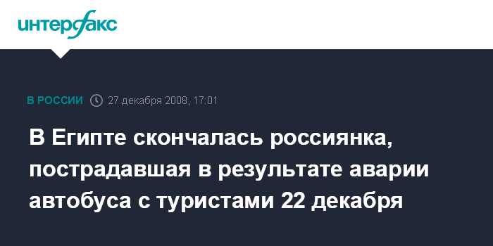 Москва. 27 декабря. INTERFAX.RU - В госпитале египетского города Шарм-эль-Шэйх скончалась еще одна российская туристка, пострадавшая в автокатастрофе в минувший понедельник, сообщает в субботу телеканал "Вести-24".