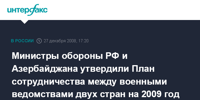 Москва. 27 декабря. INTERFAX.RU - Министр обороны России Анатолий Сердюков и его азербайджанский коллега Сафар Абиев утвердили План сотрудничества между военными ведомствами двух стран на 2009 год.